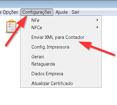 Para enviar as notasa XML geradas dentro do mês, vá na opçao Configurações -> Enviar XML para Contador .