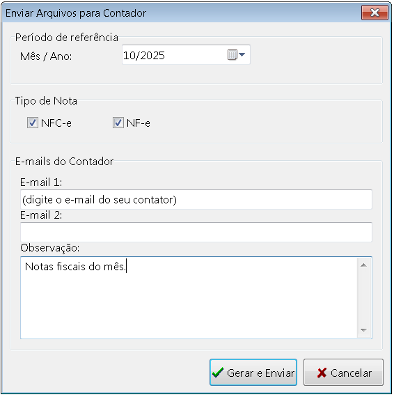 Informe o Mês / Ano que deseja enviar, marque se quer enviar as NFC-e e NF-e, e digite o e-mail do contator. O sistema permite enviar para 2 e-mails e ainda colocar uma observação.