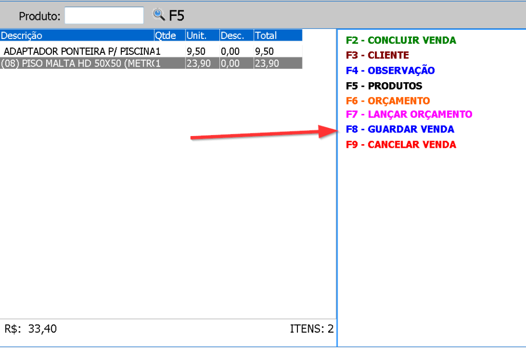 O usuário consegue guardar uma venda para continuar depois, para isso basta clicar no botão F8 – GUARDAR VENDA quando estiver preenchendo ela.