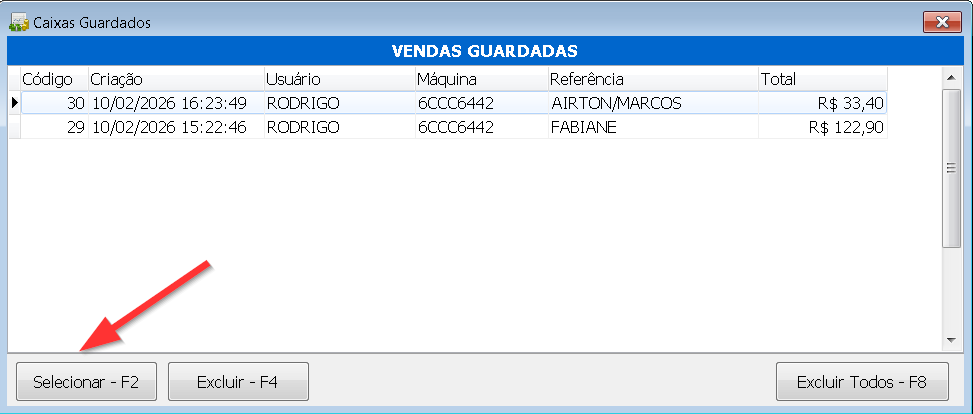 Clicar em cima da venda “guardada” e clicar em “Selecionar – F2”.
